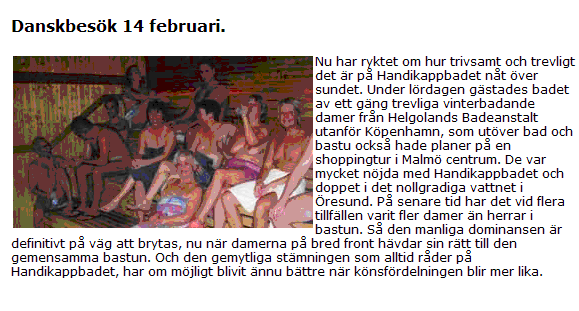 “Nu har ryktet om hur trivsamt och trevligt det är på Handikappbadet nåt över sundet. Under lördagen gästades badet av ett gäng trevliga vinterbadande damer från Helgolands Badeanstalt utanför Köpenhamn, som utöver bad och bastu också hade planer på en shoppingtur i Malmö centrum. De var mycket nöjda med Handikappbadet och doppet i det nollgradiga vattnet i Öresund. På senare tid har det vid flera tillfällen varit fler damer än herrar i bastun. Så den manliga dominansen är definitivt på väg att brytas, nu när damerna på bred front hävdar sin rätt till den gemensamma bastun. Och den gemytliga stämningen som alltid råder på Handikappbadet, har om möjligt blivit ännu bättre när könsfördelningen blir mer lika.”